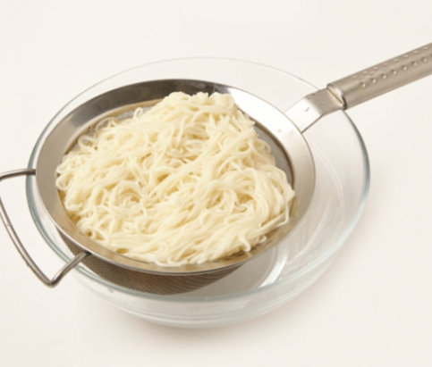 5. 소면을 건져 찬물에 헹군 뒤 체에 밭쳐 물기를 뺍니다.