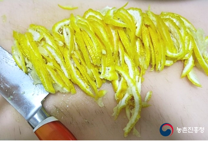2. 깨끗이 씻은 유자는 씨를 빼주고 껍질째 가늘게 채 썰어 줍니다.