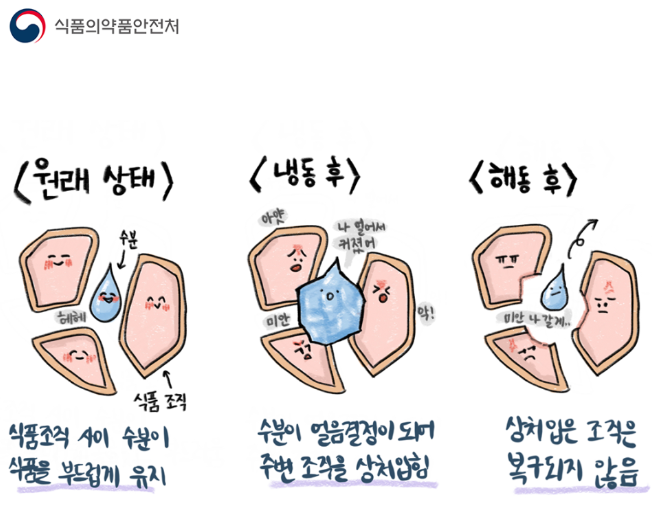 해동된 식품에 영향을 미치는 가장 큰 요인은 바로 식품에 존재하는 수분들이 얼었다가 녹으면 식품 조직을 상처입히는 것이라고 합니다.