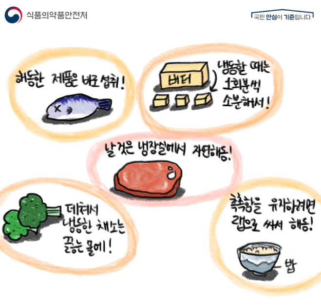 식품을 여러 번 냉동하고 해동하면 식품에 존재하거나 외부에서 들어온 미생물에 의해 오염되기도 쉽습니다. 또한 위에서 알아본 것처럼 식품의 손상도가 커져 신선도와 맛이 크게 떨어지게 됩니다. 그래서 올바르고 안전하게 해동해서 먹는 것이 중요합니다.