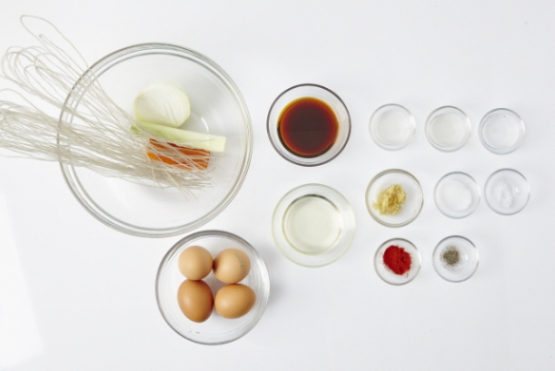 당면 40g, 양파 100g, 당근 50g, 대파 10cm, 달걀 4개, 식용유 3T, 당면밑간(설탕 1T, 간장 1T, 맛술 1T), 양념(간장 1T, 소금 1/2t, 다진 마늘 1/2T, 맛술 1T, 후춧가루 약간), 초간장(고춧가루 1t, 식초 1/2T, 간장 1/2T, 물 1T)