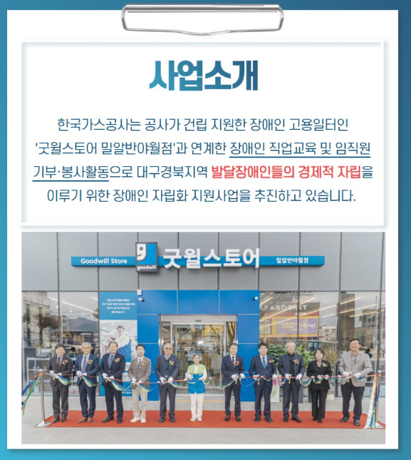 한국가스공사는 공사가 건립 지원한 장애인 고용일터인 '굿윌스토어 밀알반야점'과 연계한 장애인 직업교육 및 임직원 기부·봉사활동으로 대구경북지역 발달장애인들의 경제적 자립을 이루기 위한 장애인 자립화 지원사업을 추진하고 있다고 합니다.