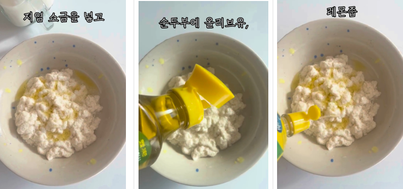 3. 순두부에 올리브유, 레몬즙, 저염 소금을 넣고 섞어줍니다.