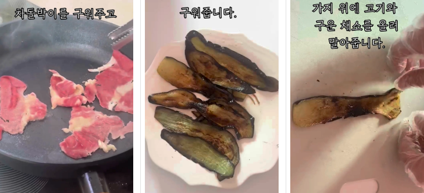 4. 차돌박이를 구워주고 가지를 길게 썰어 구워줍니다. 그리고 가지 위에 고기와 구운 채소를 올려 말아줍니다.