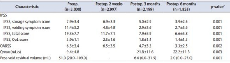 연구 결과, 전립선비대증으로 인한 증상의 심각도를 측정하는 지표인 국제전립선증상점수(IPSS)는 수술 전 평균 19.3점에서 수술 후 6개월 시점에 6.6점으로 크게 개선됐으며, 배뇨 시 소변이 나오는 속도를 의미하는 최대요속(Qmax)은 9.4mL/s에서 22.2mL/s로 증가해 배뇨능력이 현저히 향상됐다고 합니다. 또한, 잔뇨량(Post-void residual volume)도 수술 후 6개월 시점에서 크게 감소했으며, 과민성방광 증상점수(QABSS)도 유의미하게 개선됐다고 합니다.