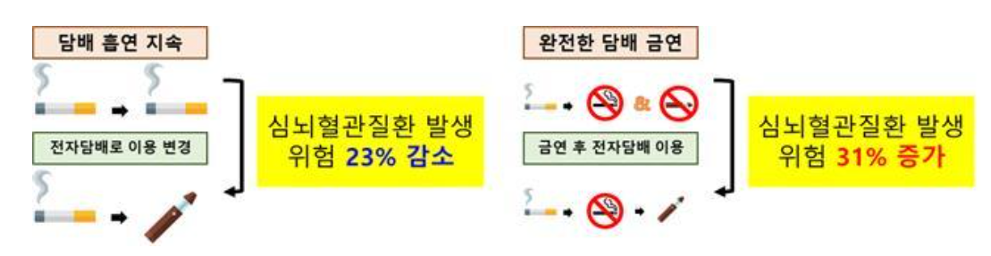 이기헌 교수는 함께 연구를 이끈 공동교신저자 박상민 교수는 "5년 미만의 기간 동안 일반담배 금연을 유지했지만, 전자 담배를 사용한 사람은 완전한 금연 상태를 유지한 사람에 비해 심뇌혈관질환 발생 위험이 31%나 증가한다는 점이 확인 됐다"고 이번 연구의 의의를 설명했다고 합니다.