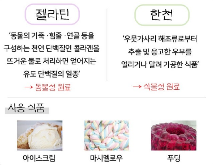이렇게 젤리와 양갱에 들어가는 동물성 원료 젤라틴과 식물성 원료 한천에 대해 알아보았습니다.