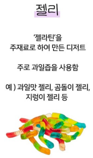 젤리는 크게 '젤라틴'을 주재료로 하여 만든 디저트를 총칭하는 말로 주로 과일즙을 사용한다고 합니다.