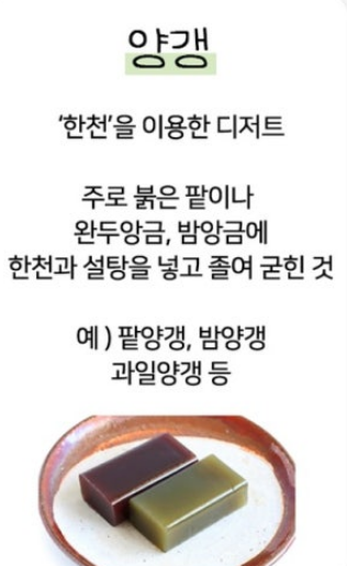 양갱은 젤리와 가까운 듯 먼 친척과 같습니다. 바로 '한천'을 이용하여, 주로 팥 또는 밤과 함께 만드는 디저트를 말한다고 합니다.