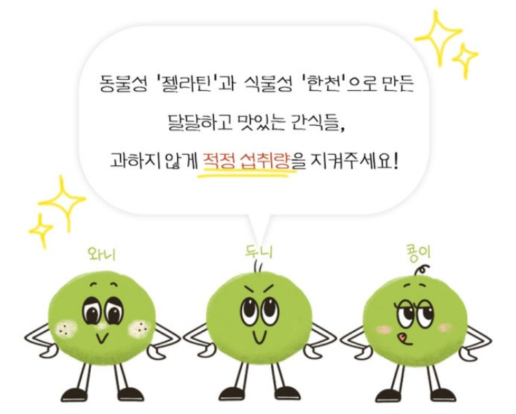 동물성 젤라틴과 식물성 한천으로 만든 달달하고 맛있는 간식들은 과하지 않게 적정 섭취량을 지켜주어야 합니다.