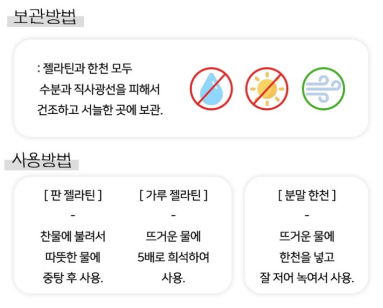 젤라틴과 한천 모두 수분이 있고 온도가 높은 곳에서 보관하면 품질이 저하되기 때문에 수분과 직사광선을 피해서 건조하고 서늘한 곳에 보관해야 합니다.