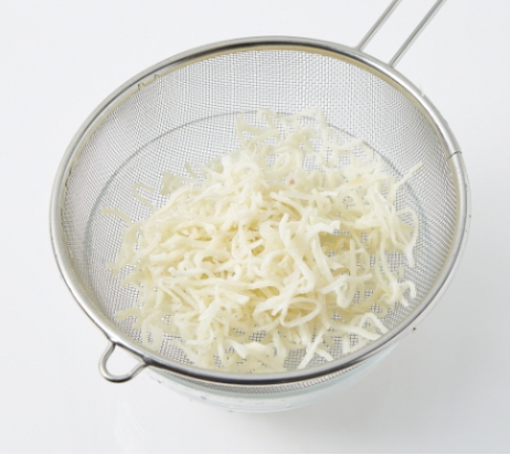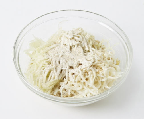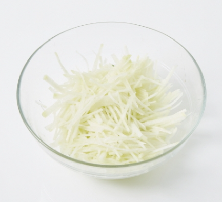 3. 무는 곱게 채 썰어 굵은 소금 1t에 버무려 10분간 절인 뒤 물기를 짭니다.