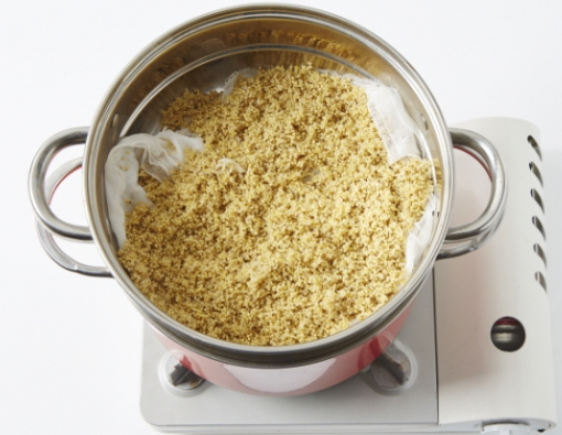1. 김이 오른 찜기에 면포를 깔고 조(2컵)를 얹어 20분간 쪄서 고두밥을 만듭니다.