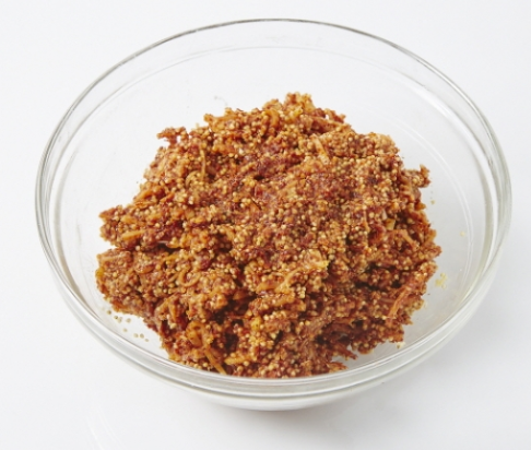 우선 조를 찜기에 넣고 고두밥을 만들어 줍니다. 여기에 채 썬 무, 엿기름가루를 넣고 진미채에 버무립니다. 이후 실온에서 하루 동안 숙성하면 완성됩니다.