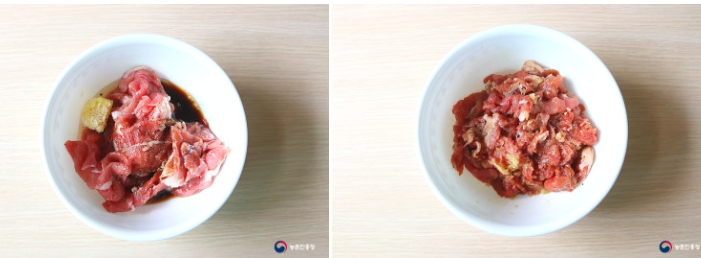 3. 핏물을 제거한 소고기는 불고기양념장(간장 1큰술, 설탕 1.5큰술, 참기름 1큰술, 다진 마늘 1큰술, 맛술 1큰술, 굴소스 1작은술, 후추 약간)에 버무려 재워줍니다.