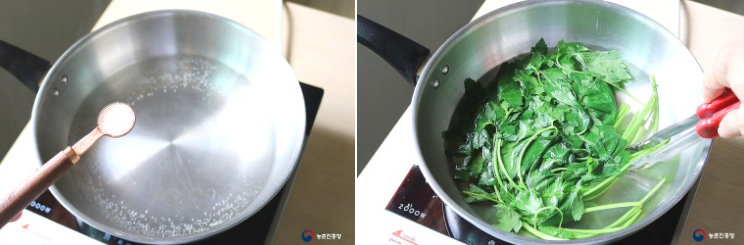 손질은 어떻게 해야 할까요? 끓는 물에 소금을 조금 넣고 데쳐 사용하면 됩니다. 줄기 부분이 질기기 때문에 줄기 먼저 세워 데친 뒤, 10~15초 후 잎 부분을 마저 넣고 데쳐줍니다.