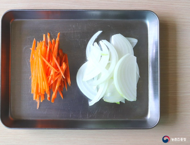 1. 참나물 80g은 6cm 길이로 썰고 당근 1/8개와 양파 1/4개는 가늘게 채 썰어 줍니다.