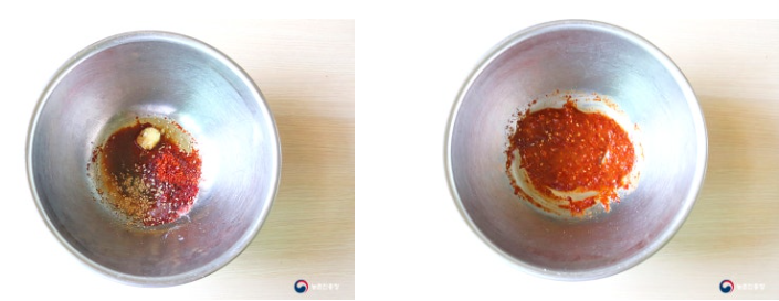 5. 볼에 생채양념재료(가장 0.5큰술, 설탕 0.5큰술, 참기름 1큰술, 고춧가루 1큰술, 식초 1큰술, 멸치액젓 1작은술, 다진 마늘 1/작은 술, 통깨 1큰술)를 넣고 고루 섞어줍니다.