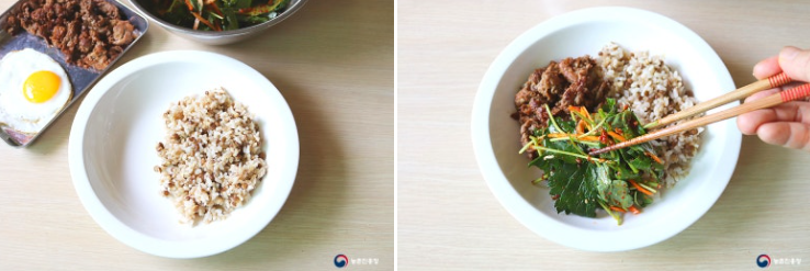 7. 그릇에 밥 1 공기를 담고 소불고기와 참나물생채무침을 소복하게 올린 뒤 달걀 프라이를 올려줍니다.