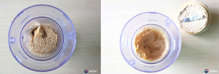 3. 믹서기에 깨즙 소스 재료(참깨 2큰술, 두부 40g, 설탕 1작은술, 맛술 1/2큰술, 간장 2작은술, 소금 1/2작은술, 참기름 1큰술)를 모두 넣고 곱게 갈아줍니다.