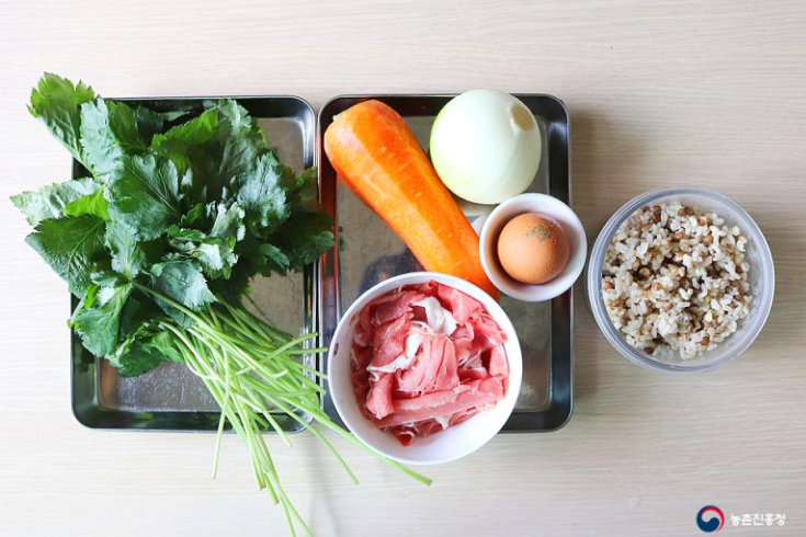 밥 1 공기, 소고기 불고기용 100g, 참나물 80g, 달걀 1개, 당근 1/8개, 양파 1/4개, 불고기 양념 재료(간장 1큰술, 설탕 1.5큰술, 참기름 1큰술, 다진 마늘 1큰술, 맛술 1큰술, 굴소스 1작은술, 후추 약간, 참나물 생채양념 재료(간장 0.5큰술, 설탕 0.5큰술, 참기름 1큰술, 고춧가루 1큰술, 식초 1큰술, 멸치액젓 1작은술, 다진 마늘 1/2작은술, 통깨 1큰술)