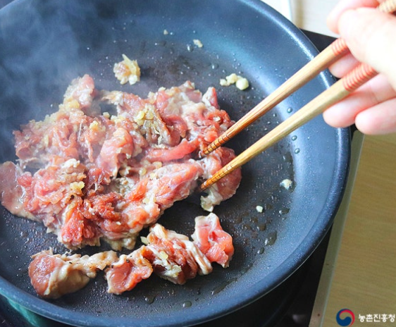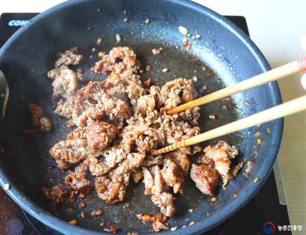 4. 같은 팬에 식용유 1큰술을 두른 뒤 센 불로 달궈 양념한 소고기를 넣고 볶아 건져줍니다.