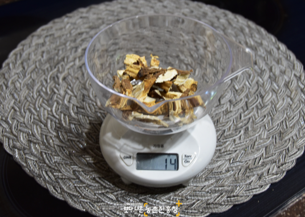 1. 말린 참당귀 16g과 말린 황기 40g을 씻어 준비합니다. 작은 요리용 저울을 사용해 정확한 양의 참당귀와 황기를 준비했습니다. 참당귀와 향기는 약초를 판매하는 약재상에 가면 구입할 수 있습니다.