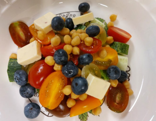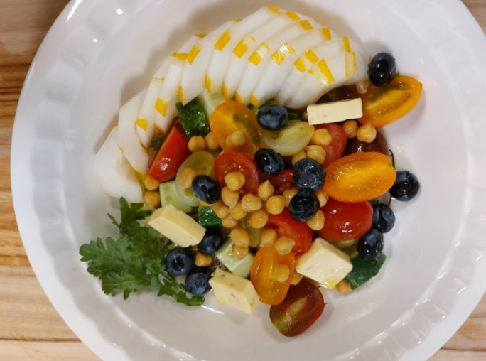 8. 오이, 방울토마토, 블루베리, 병아리콩 등 준비된 재료를 머음직스럽게 담고 가장자리에 참외와 약간의 쑥갓으로 예쁘게 장식합니다.