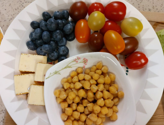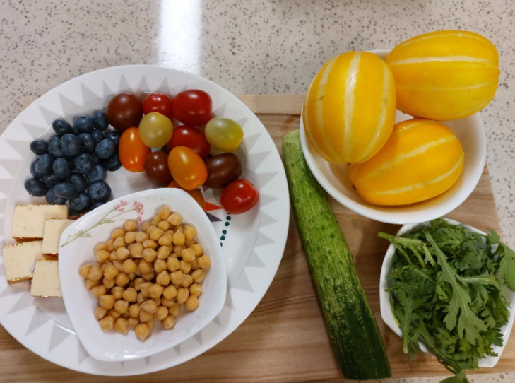 오이 1/2개, 방울토마토 10개, 블루베리 10~15개, 미니치즈 5개, 병아리콩 약간, 참외 1/2개, 쑥갓 2~3장, 소스(화이트발사믹 1.5T, 올리브유 3T, 꿀 1T, 소금 약간)