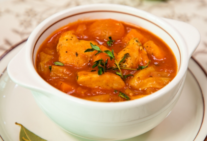 큐브 닭가슴살 1봉, 물 800㎖, 치킨스톡 0.5T, 양파 반개, 당근 1/3개, 양배추 1/4개, 방울토마토 200g, 토마토소스 4T, 월계수 잎 2장