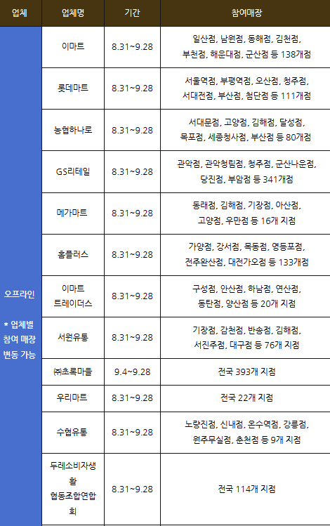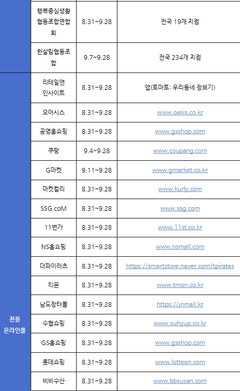 추석맞이 농축수산물 할인대전은 8월 31일(목)부터 9월 28일(목)까지 4주 동안 진행된다고 합니다.