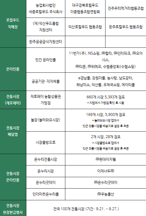 한국 간편 결제 진흥원의 제로페이 앱(APP)을 통해 1인당 3~4만 원 한도로 20~30% 할인된 가격에 모바일 상품권을 구매하여 지정된 전통시장 가맹점에서 결제할 수 있습니다. 또한 모바일 이용이 익숙하지 않은 고령층을 위해 9월 11일부터 「제로페이 농할상품권 65세 이상 전용 판매」를 실시한다고 합니다. 9월 21일(목)부터 9월 27(수)까지는 전통시장에서 당일 구매금액의 30%를 온누리상품권으로 환급해 주는 현장 환급 행사가 진행됩니다.