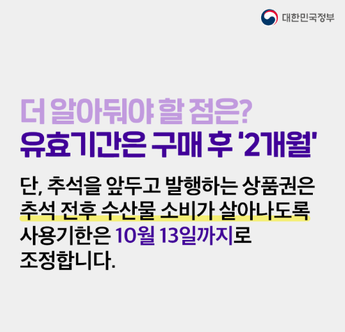 수산물 전용 제로페이 모바일 상품권 유효기간은 구매 후 '2개월'이라고 합니다. 단, 추석을 앞두고 발행하는 상품권은 추석 전후 수산물 소비가 살아나도록 사용기한은 10월 13일까지로 조정한다고 합니다.