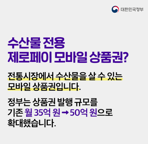 전통시장에서 수산물을 살 수 있는 모바일 상품권입니다. 정부는 상품권 발행 규모를 기존 월 35억에서 50억 원으로 확대했다고 합니다.