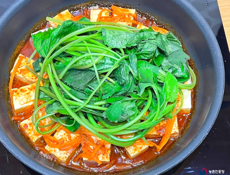 6. 끓으면 불을 끄고 그릇에 옮겨 담아 통깨를 솔솔 뿌려주면 '취나물 두부두루치기'가 완성됩니다.