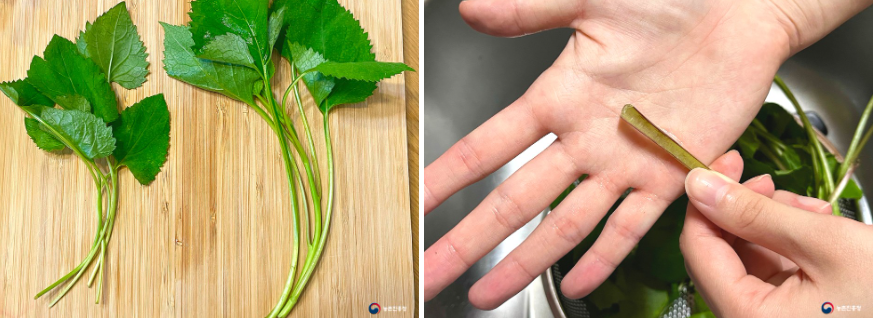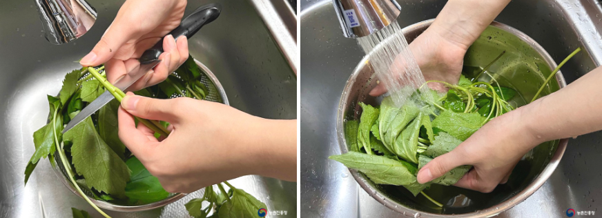 손질할 때는 질기고 억센 굵은 줄기는 모두 다듬어주고 상한 잎 부분을 잘라주면 됩니다. 손질한 다음 찬물로 세척해 줍니다.
