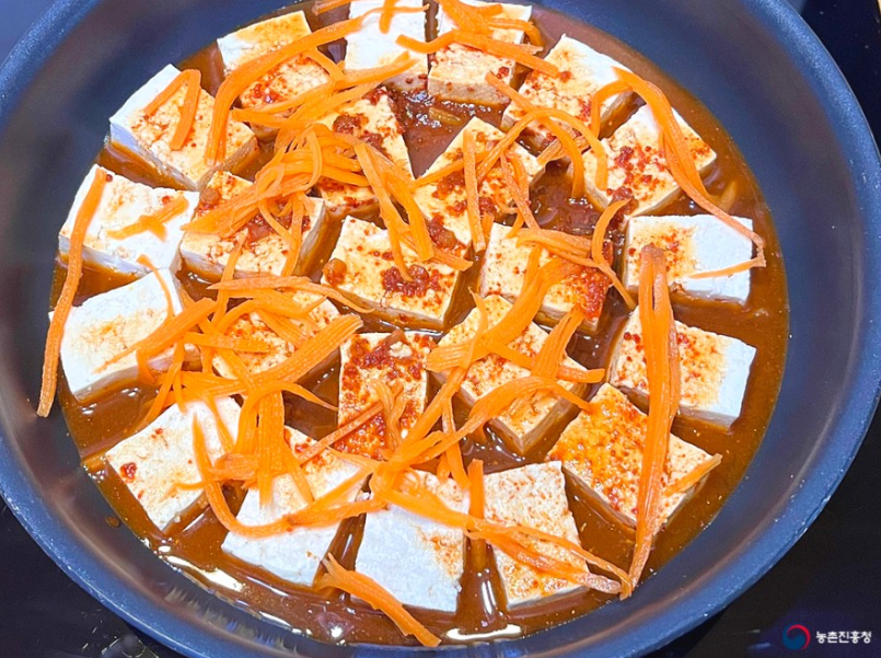 3. 프라이팬 위에 두부를 가지런히 올린 다음, 만들어 둔 양념을 부어줍니다. 미리 채 썰어 놓은 당근을 두부 위에 올려 뚜껑을 닫고 중불에서 끓여줍니다.