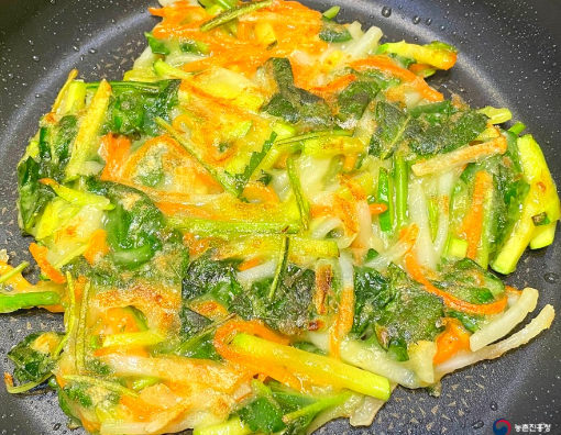 취나물 180g, 당근 1/4개, 양파 1/4개, 애호박 1/4개, 감자 1/2개, 튀김가루 2/3컵, 부침가루 2/3컵, 피자치즈 2/3컵, 물 1컵