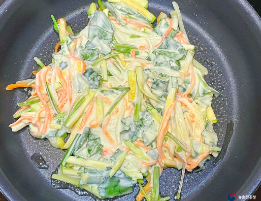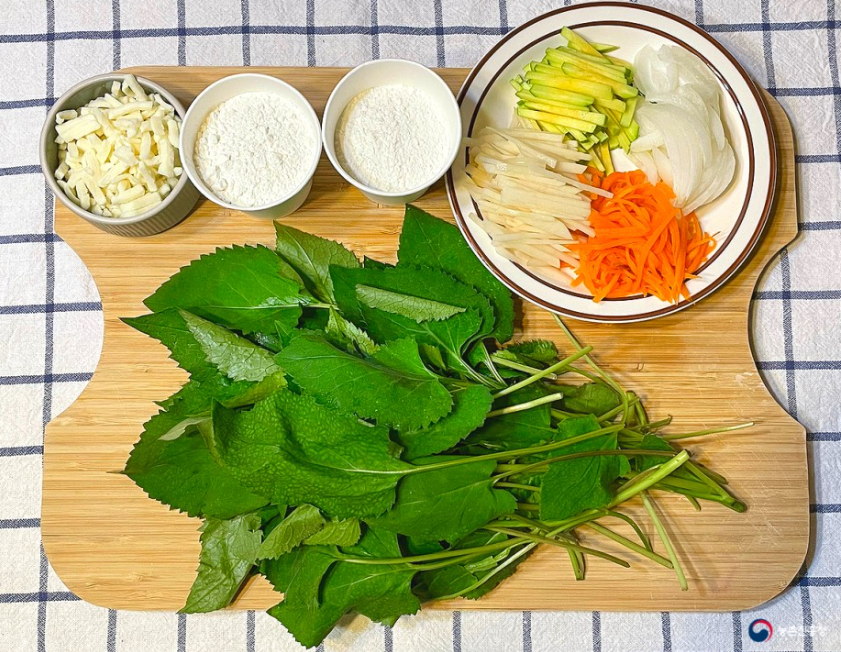 취나물 180g, 당근 1/4개, 양파 1/4개, 애호박 1/4개, 감자 1/2개, 튀김가루 2/3컵, 부침가루 2/3컵, 피자치즈 2/3컵, 물 1컵