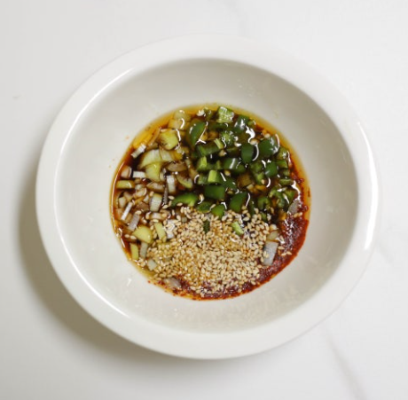9. 분량의 청양고추 양념장 재료를 잘 섞어줍니다. 완성된 취나물 솥밥에 취향껏 넣어 비벼 먹습니다.