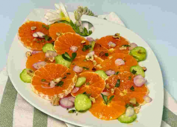 카라카라 오렌지 1~2개, 자몽이나 감귤류 1개, 얇게 썬 청외 1/4개, 얇게 썬 적양파 1/4개, 구운 견과 1/4컵(다져서 준비), 와인 비니거 드레싱(와인비니거 1큰술, 올리브오일 3큰술, 디종 머스타드 1작은술, 꿀 1작은술, 코셔소금 1/4작은술, 흑후추 조금, 잘게 썬 민트)