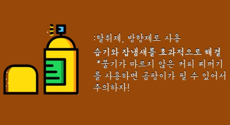 습기와 잡냄새를 효과적으로 해결할 수 있다고 합니다. 하지만, 물기가 마르지 않은 커피 찌꺼기를 사용하면 곰팡이가 필 수 있어서 주의해야 합니다.