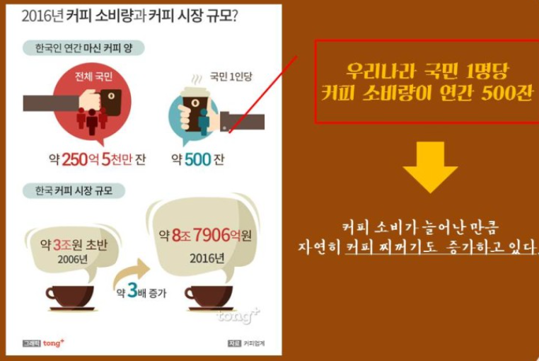 2016년 조사에 따르면 우리나라 국민 1명당 커피 소비량이 연간 500잔이라고 합니다. 커피 소비가 늘어난 만큼 자연히 커피 찌꺼기도 증가하고 있습니다.
