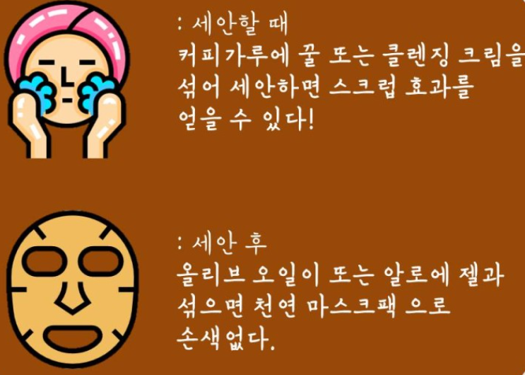 커피가루에 꿀 또는 클렌징크림을 섞어 세안하면 스크럽 효과를 얻을 수 있습니다.