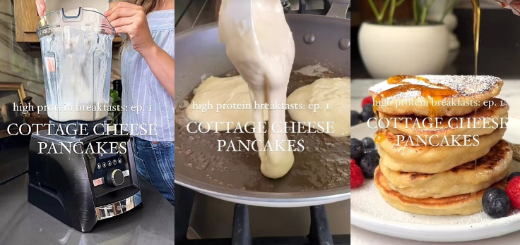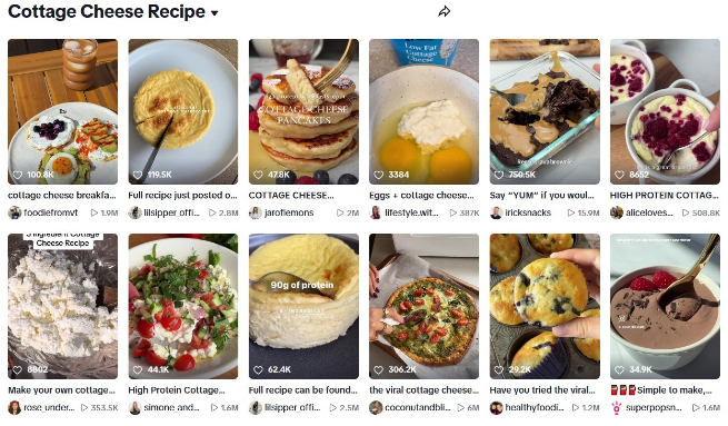 SNS에서는 밀가루 반죽에 달걀과 코티지 치즈를 넣고 만든 머핀·팬케이크·피자 등이 활발히 공유되고 있습니다. 뉴욕의 요리 작가 제이크 코헨(Jake Cohen)이 올린 '코티지 치즈 쿠기 반죽' 레시피는 틱톡에서 300만 조회수를 넘기며 화제를 모으기도 했습니다.