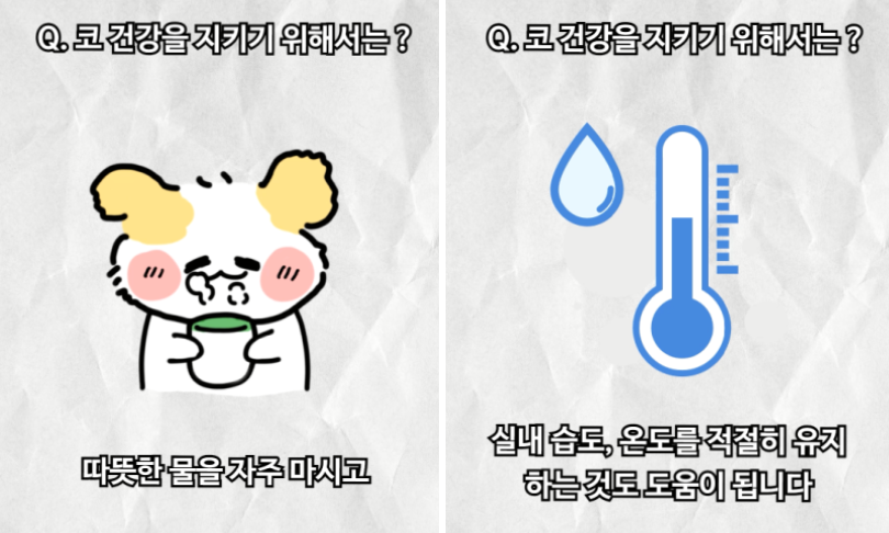 코 건강을 지키기 위해서는 따뜻한 물을 자주 마시고 실내 습도, 온도를 적절히 유지하는 것이 도움이 된다고 합니다.