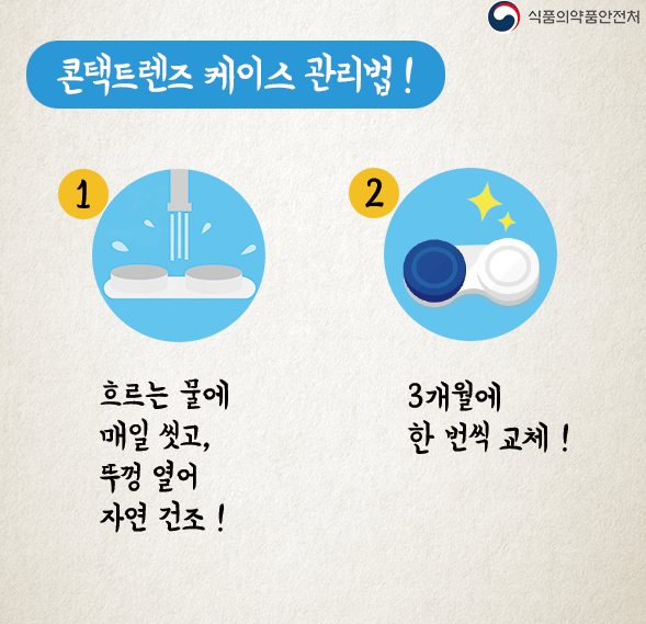 콘택트렌즈 케이스는 흐르는 물에 매일 씻고, 뚜껑을 열어 자연건조 시켜줍니다. 또한 3개월에 한 번씩 반드시 교체해야 합니다.