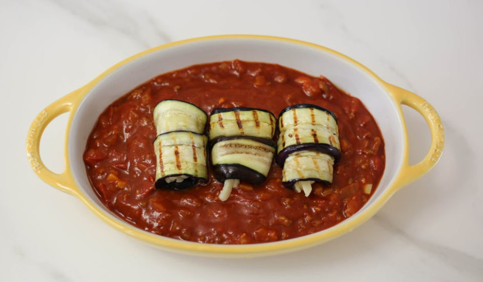 가지를 돌돌 말아 만드는 롤라드에 토마토 소스를 곁들인 요리입니다.
