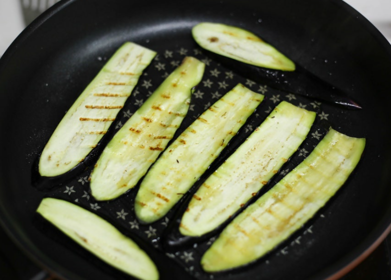 2. 수분을 제거한 가지를 팬에서 구워줍니다.