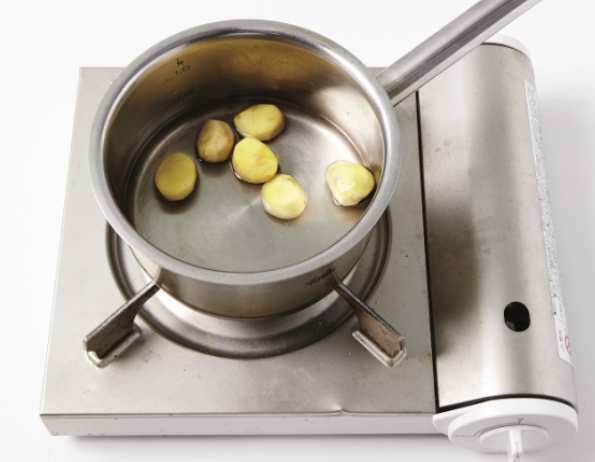 4. 밤은 껍질을 벗겨 냄비에 물 1컵과 함께 넣고 삶아줍니다.